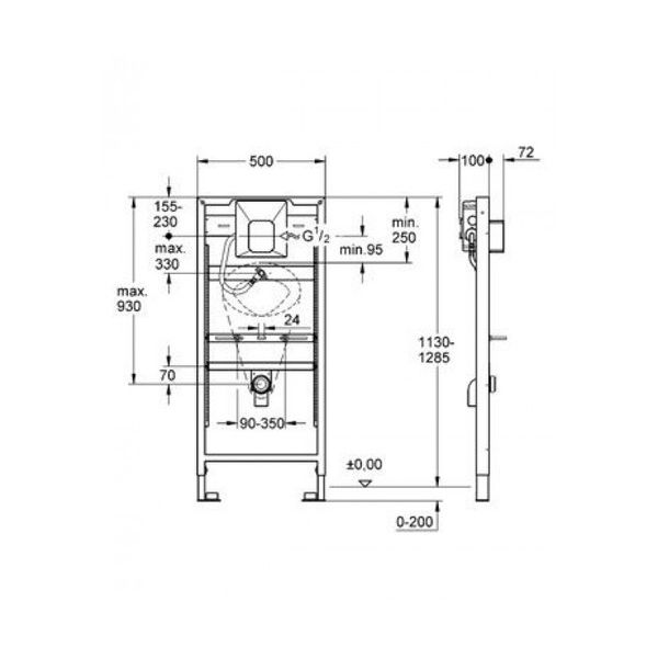 Габаритні розміри інсталяційною системи (ВхШхГ): 1130х500х120 мм, глибина і висота регулюється.