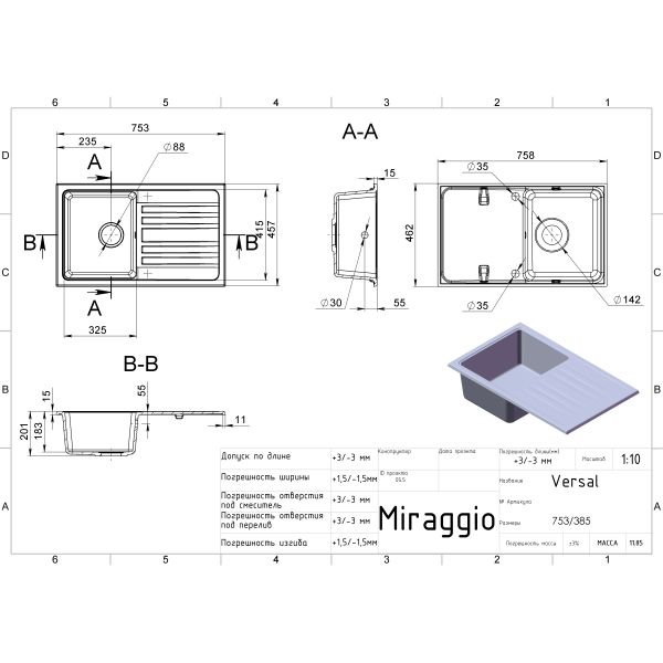 Кухонна мийка MIRAGGIO Valencia виготовлена з кварцового піску. Вона витримує перепади температур, стійка до забруднень і практична у використанні. Матеріал, з якого вона виготовлена складається з 80% кварцового піску різних фракцій і 20% сполучної речовини (поліефірної смоли) зі спеціальними антибактеріальними добавками, що забезпечує надійність, якість і довговічність продукту.