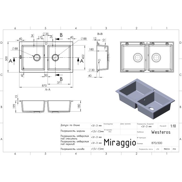 Кухонна мийка MIRAGGIO Westeros виготовлена з кварцового піску. Вона витримує перепади температур, стійка до забруднень і практична у використанні. Матеріал, з якого вона виготовлена складається з 80% кварцового піску різних фракцій і 20% сполучної речовини (поліефірної смоли) зі спеціальними антибактеріальними добавками, що забезпечує надійність, якість і довговічність продукту.