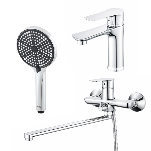 Набір змішувачів VENTA виготовлений з високоякісної латуні, що гарантує тривалий термін служби, корозійну стійкість та стійкість до механічних навантажень. Завдяки хромованому покриттю вироби мають привабливий сучасний вигляд, легко вписуються в будь-який стиль інтер’єру — від класичного до мінімалістичного.