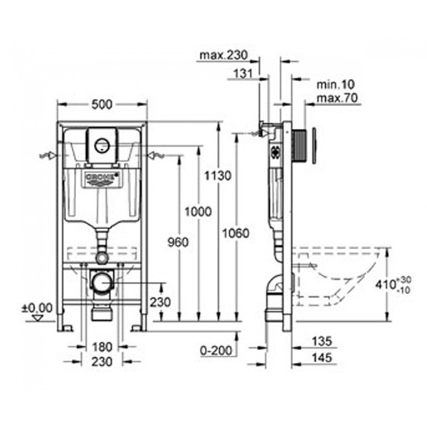 Габаритные размеры инсталляционной системы (ВхШхГ): 1130х500х230 мм, глубина и высота регулируется.