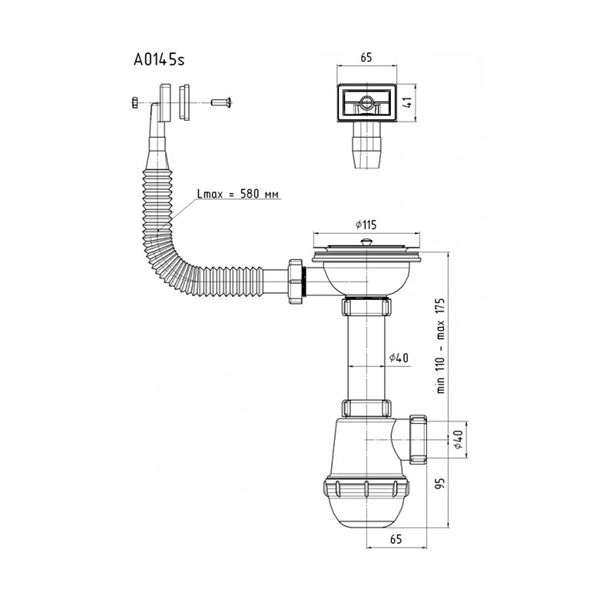 Сифон для кухни Ани-Пласт 'А 01 45 S' 1 1/2'x40 (разборная горловина) с переливом предназначен для установки с любой сантехнической арматурой. Благодаря наличию гибкой отводной трубы, сифон позволяет легко решить проблему отвода сточных вод в условиях ограниченного пространства.