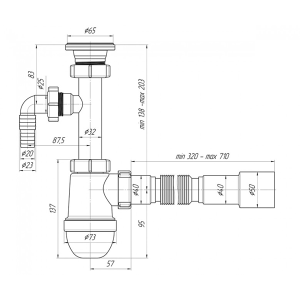 Сифон для умывальника Ани-Пласт 'С 13 15' 1 1/4'х40 (разборная горловина) с отводом для стиральной машины с гибкой трубой 40х40/50 предназначен для установки с любой сантехнической арматурой. Благодаря наличию гибкой отводной трубы, сифон позволяет легко решить проблему отвода сточных вод в условиях ограниченного пространства.