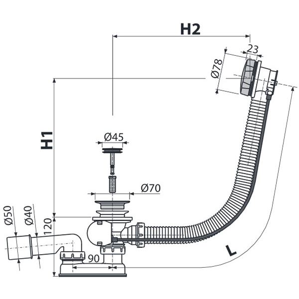 Пластиковый сифон автомат для ванн со сливом-переливом изготовлен из высококачественного полипропилена. Поворотная головка - металл с хромированным покрытием, управляет открытием и закрытием выпуска сифона с помощью тягового троса. Пробка изготовлена из металлического сплава с хромированным покрытием.