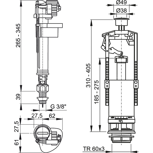 Набор Alca Plast SA2000S 3/8' с нижним пластиковым подключением и одинарной START/STOP кнопкой хром и комплектом крепления бачка к унитазу. Подходит для бачков разных типов так как имеет стандартные диаметры кнопки, резьб и прижимной гайки. Высота стойки слива регулируется. Уровень наполнения сливного бачка регулируется поплавком клапана впуска воды.