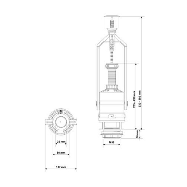 Сливной механизм производства KK Pol ZSB/210 оборудован одинарной кнопкой. Экономичный расход воды можно настроить используя регулировку слива, которая позволит выставить необходимые параметры. Благодаря широкому диапазону регулировки по высоте данная модель подходит для смывных бочков различной высоты.
