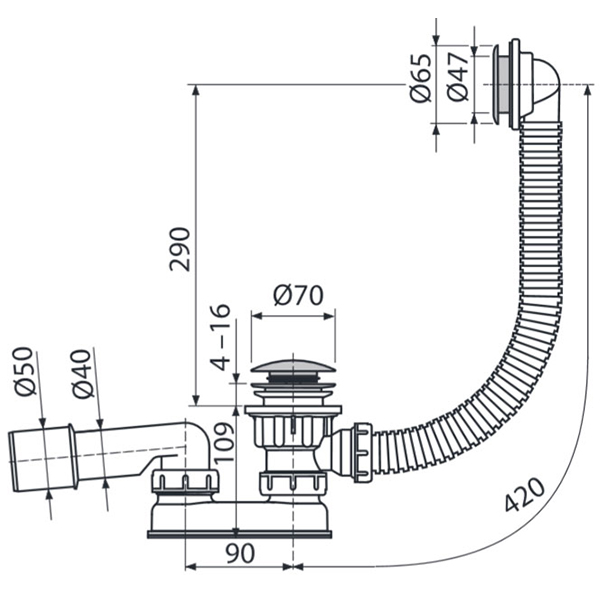 Сифон для душового піддона Alca Plast 'А503КМ' 50 мм з переливом 420мм виготовлений з термостійкого пластику, міцного за своєю структурою і стійкого до агресивних середовищ. Він простий в монтажі і не становить ніяких труднощів при прочищенні. Матеріал покрили шаром хрому, завдяки якому виріб має розкішний блиск і естетичний вигляд.