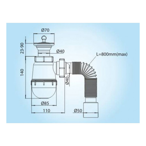 Сифон для кухні SoloPlast 'K1310' 1 1/2 'x40 з гнучкою трубою 40x50 з пробкою. Конструкція сифона передбачає надійне формування гідрозатвору, що перешкоджає попаданню неприємних запахів і здатна впоратися з великим потоком води.