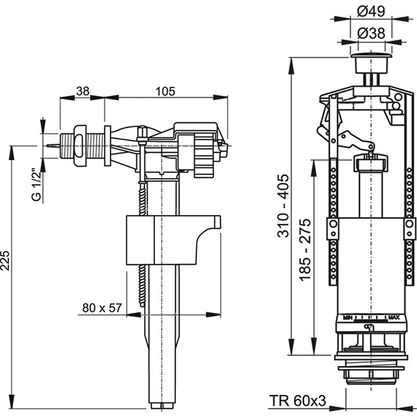 Набір Alca Plast 1/2' SA2000 з боковим пластиковим підключенням і одинарною START/STOP кнопкою хром з клапаном нижнього підведення води і комплектом кріплення бачка до унітазу. Підходить для бачків різних типів так як має стандартні діаметри кнопки, різьб і притискної гайки. Висота стійки слива регулюється. Рівень наповнення зливного бачка регулюється поплавком клапана впускання води.