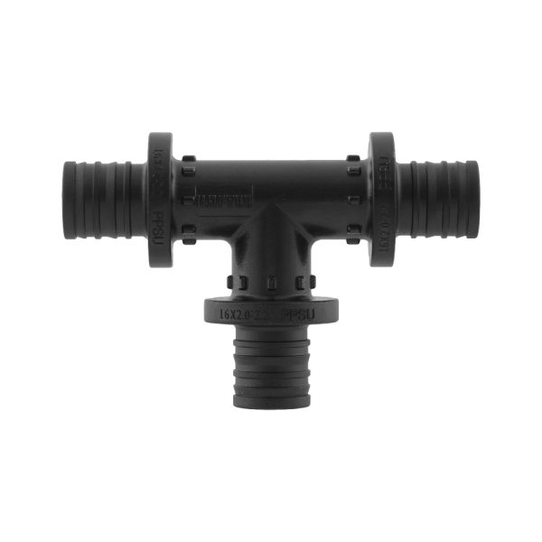 Трійник натяжний - PPSU трійник призначений для створення з'єднань в системах труб зшитого поліетилену PEX-A, PEX-B, PEX-C, PERT. Використовується в системах питного, господарського, технологічного, холодного і гарячого водопостачання, опалення, стисненого повітря. З'єднувачі мають спеціально профільовані штуцери, які вставляються в розширений кінець труби. А потім на з'єднання натягується кільце з PVDF матеріалу за допомогою ручного або гідравлічного преса. Труба герметично фіксується кільцем на штуцері з'єднувача.