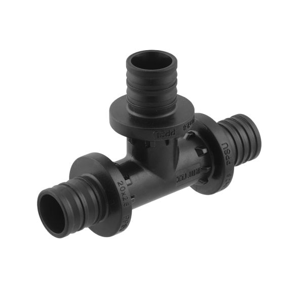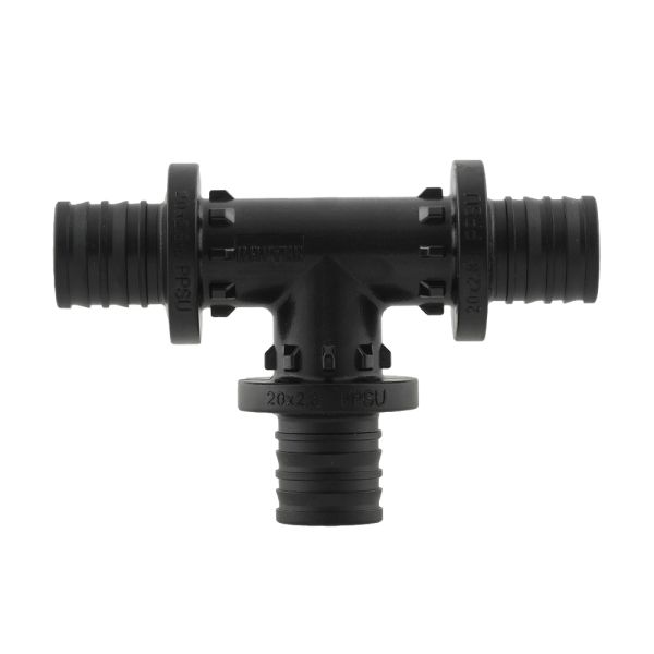 Трійник натяжний - PPSU трійник призначений для створення з'єднань в системах труб зшитого поліетилену PEX-A, PEX-B, PEX-C, PERT. Використовується в системах питного, господарського, технологічного, холодного і гарячого водопостачання, опалення, стисненого повітря. З'єднувачі мають спеціально профільовані штуцери, які вставляються в розширений кінець труби. А потім на з'єднання натягується кільце з PVDF матеріалу за допомогою ручного або гідравлічного преса. Труба герметично фіксується кільцем на штуцері з'єднувача.